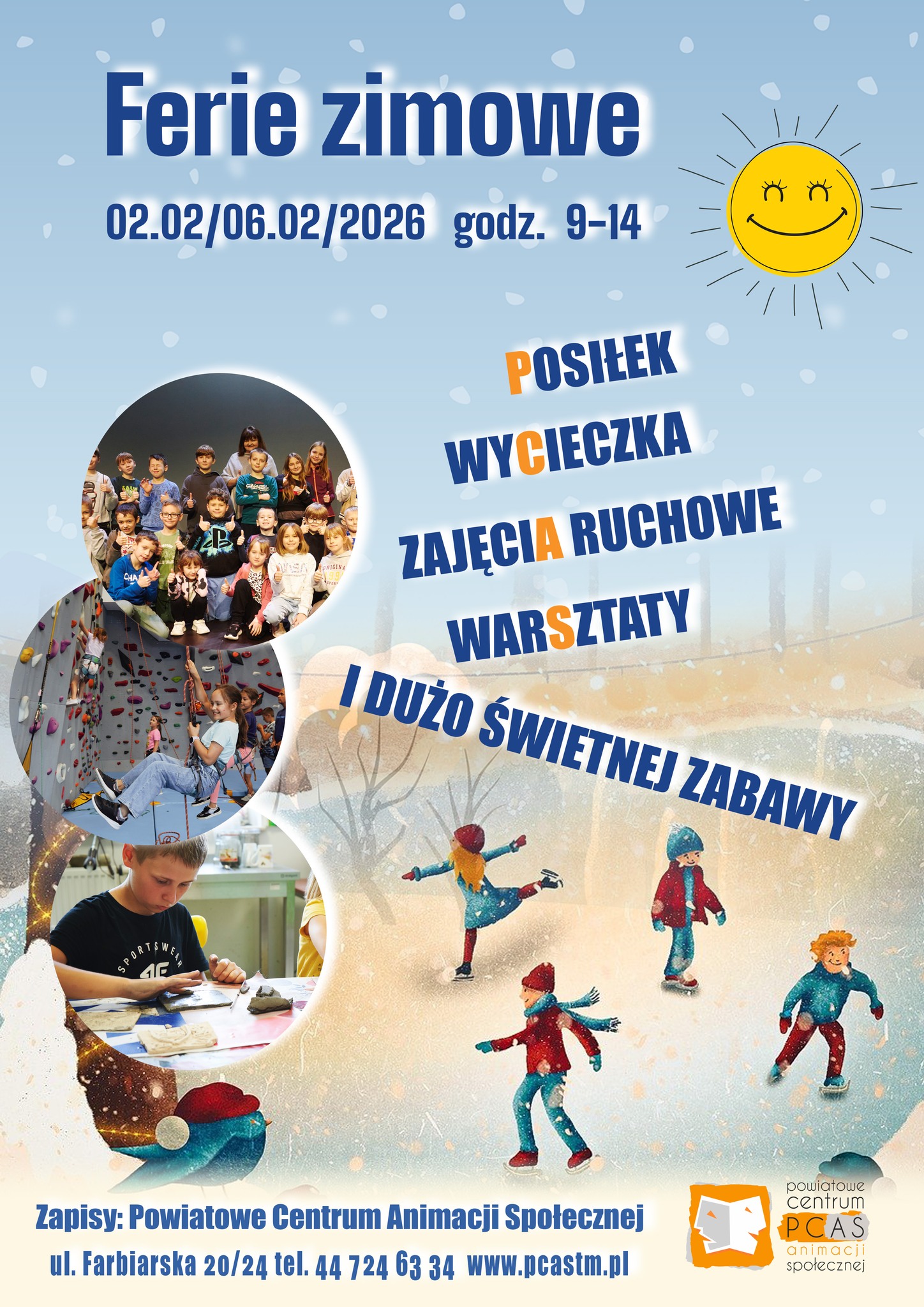 Przygotowaliśmy dla Was super atrakcje. Autokarem wyruszymy do Parku Rozrywki Hopa Lupa oraz do Muzeum Marcepanu i Zamku Królewskiego w Piotrkowie. Nasi milusińscy wezmą udział w warsztatach czekoladowych, ceramicznych, wspinaczkowych i sportowych. Odwiedzimy też Muzeum im. Antoniego Hrabiego Ostrowskiego i bawialnię „Mała Panda”, a także obejrzymy spektakl pt.: „Królowa Śniegu”. Nie zabraknie zabaw integracyjnych oraz pysznych obiadków i kolorowych upominków.